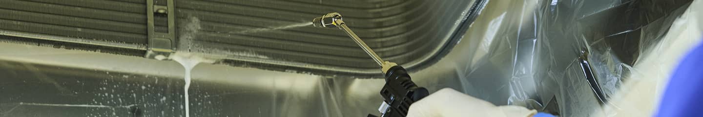ダスキンでは奥にある熱交換器やフィンに付着した汚れを高圧洗浄機で丁寧に洗浄します。